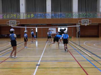 6年生の体育では「ソフトバレーボール」に取り組んでいます。軽くて軟らかいボールを使いネットを挟んで行うソフトバレーボールです。今日はボールをつなぐために、どこを狙って、どんなボールにすれば良いかを考えて、基本的な動きを身につけられるように実践しました。やわらかいボールなので、恐怖心などもなく、チームで協力してゲームを楽しむことができます。