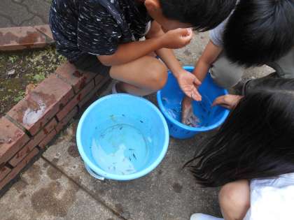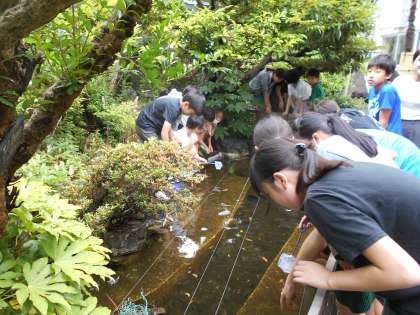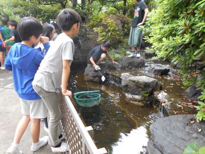 5年生の理科では「生命のつながり」について学習しています。今日は、昇降口近くの池にいるメダカをとって観察しました。池をじっくり見るとたくさんのメダカがいることにびっくりしていました。これから、メダカの雄雌の見分け方や卵を産ませるための飼い方などを学習していきます。