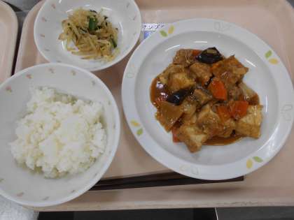 ごはん 家常豆腐 もやしのごま風味 牛乳
