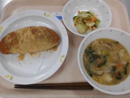 きなこあげパン みそワンタンスープ 梅ドレッシングサラダ 牛乳