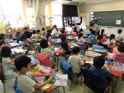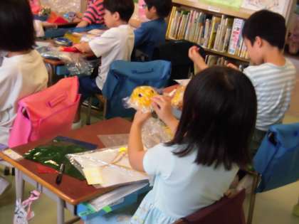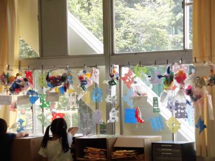 1年生の図工では「ひかりのくにのなかまたち」の学習をしています。光に透ける材料を使い、光を透した様々な色を楽しむ作品を作りました。 透明なビニール袋に、色とりどりのセロハンのを入れて、色が光にきれいに透けているか確かめながら作品を作っていました。出来上がった作品を光がとおる窓際に飾るとキラキラと光り、とてもきれいです。