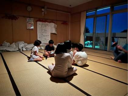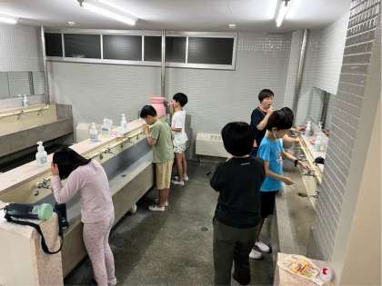 お風呂の後は、部屋でゆっくり過ごしました。ゲームをしたり、5年生から怖い話を聞かせてもらったりしました。歯磨きをして夜の会を始めます。