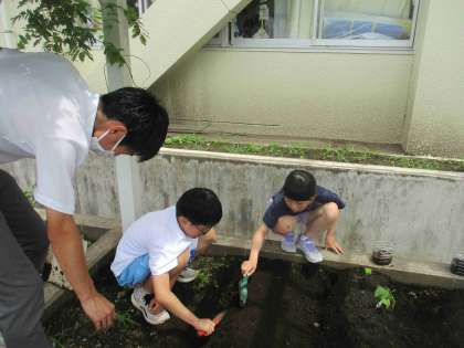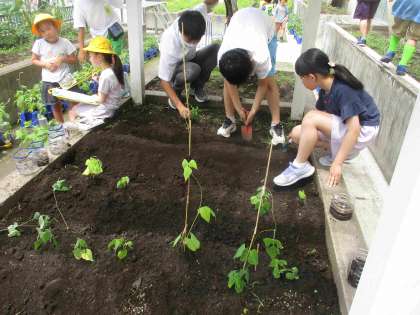 5年生が理科で、植物の発芽する条件を学習していましたが、その実験のために育てていたインゲンマメの芽が成長してきました。そこで、校庭の花壇に植えることにしたそうです。実験でたくさんのことを教えてくれたインゲンマメが、さらに大きくなるとうれしいですね。