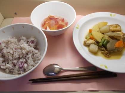 ゆかりごはん 五目うま煮 あじさいゼリー 牛乳