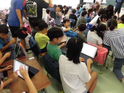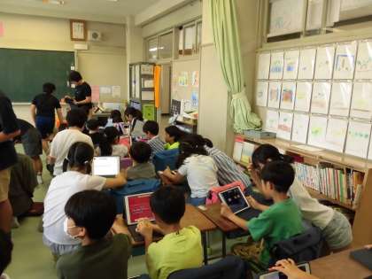 1年生のクラスでは、6年生からiPadの使い方を教えてもらいました。学習でも活用するロイロノートの使い方を、6年生が1年生とペアになって教えました。ペア二人で写真を撮って、提出箱に提出したり、先生から届いたメッセージの開き方も学習しました。6年生が寄り添って丁寧にひとつひとつ教え、1年生も一生懸命に操作していました。iPadの使い方やルールを守ることもしっかりと学習しました。最後には6年生に「ありがとうございました!」と大きな声で感謝の気持ちを伝えました。