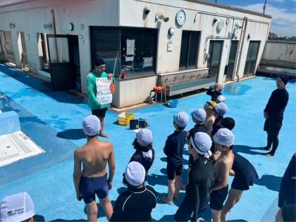 ひまわり学級のプール開きが行われました。プールの約束「かぶとむし」や、バディの友達を確かめました。今年一番の暑さになり、プールに入るのはとても気持ちがよかったそうです。プールから富士山がきれいに見えました。
