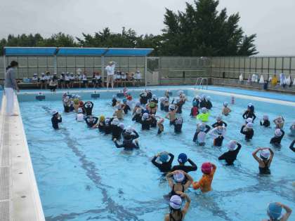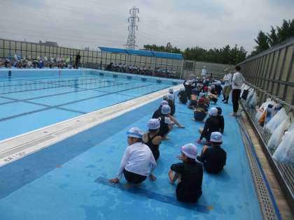 1年生がプールに入りました。水も冷たくなく、気持ちがよかったそうです。プールに入るとうれしくて、思わず声が出てしまいますが、みんなが静かにしないと、次の指示が聞こえません。周りの子と声を掛け合って、素早く指示を聞くことができました。立派です。
