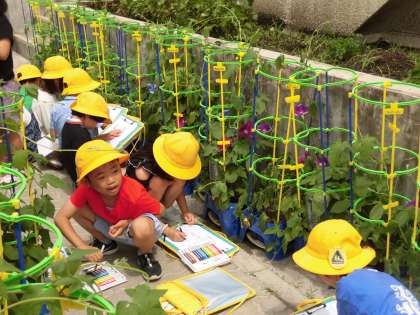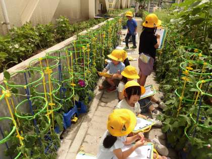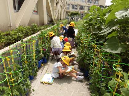 1年生が育てているあさがおが、元気よく大きく成長しています。つぼみがたくさんつき、きれいな花もたくさん咲き始めました。「つぼみがあった!」「紫のお花がさいてる!」と嬉しそうに話してくれました。つぼみをしっかりと観察して、かんさつカードに絵をかいて、色や形、大きさ、触った感じなどを記録しました。
