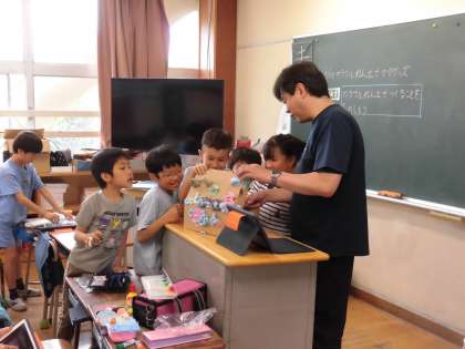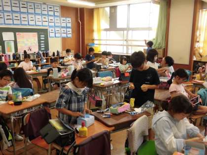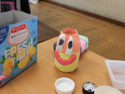 3年生の図工では「カラフル粘土」の学習をしています、紙粘土に絵の具で色を付けてカラフルな粘土を作り、それを持ち寄った空き箱やカップ、ペットボトルなどにはりつけて、 小物入れや鉛筆立てなど、日常で使う小物を作りました。絵の具の量を調整したり、工夫が見られました。とても素敵な作品が出来上がり、おうちで使うのが楽しみの様子でした。