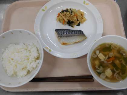 ごはん さばの塩焼き 高野豆腐入りおかずサラダ すまし汁 牛乳