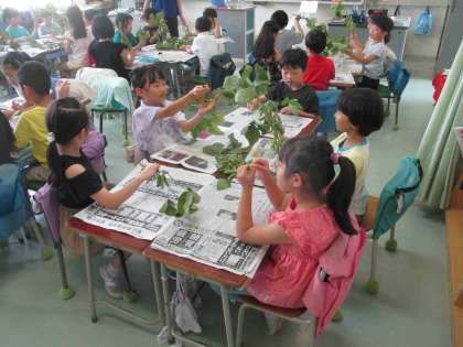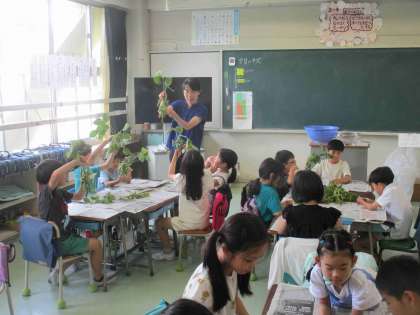 2年生とひまわり学級の皆さんが枝豆のさや取りをしました。明正小のみんなが給食で食べるためです。グループに枝豆が配られて、様子を観察しました「アサガオの葉より大きいね。」「土に中にあると思っていた。」「4つぶも入っている。」「葉のいいにおいがする。」と、いろいろなことに気付くことができました。