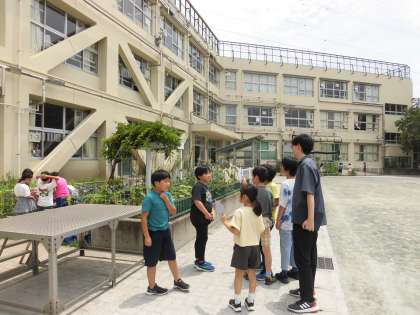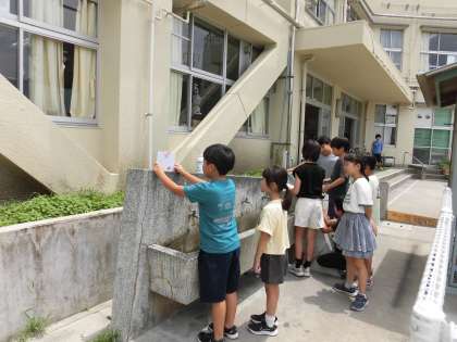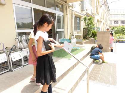 4年生の算数では「角の大きさ」の学習をしています。分度器の正しい使い方、 分度器の仕組みと角度の単位などについて学びました。今日は、厚紙を利用して手作りの分度器を作成し、様々なものの角度を測りました。校庭でも、手すりの角度や柱の角度を測り、記録しました。手作りの分度器の使い方もしっかりと理解して、測定の仕方をわかりやすく教えてくれました。さらに角の大きさの理解を深めることができました。