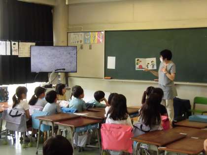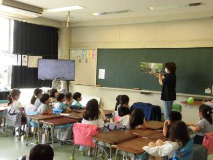 1年生のクラスでさくらママによるおはなし会が開催されました。夏にちなんだ内容の手遊びや絵本、写真絵本をたくさん紹介していただきました。「この本大好き!」「おもしろかった!」「また読んでみたい!」という声もたくさん聞こえてきました。目を輝かせて、しっかりとおはなしを聞く姿が印象的でした。