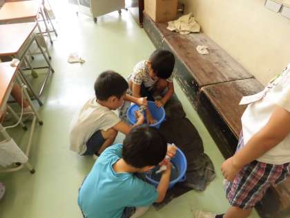お昼休みが終わると掃除の時間になります。お昼休みにしっかり遊んだあと、掃除の時間が始まると、びしっと気持ちを切り替えて、教室はもちろん、図工室や家庭科室、廊下や階段、下駄箱など、協力して学校内の掃除が始まります。1年生も自分たちでしっかりと教室の掃除ができるようになりました。雑巾しぼりもとても上手になりました。