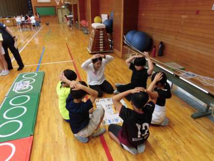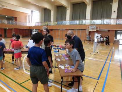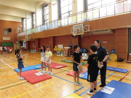 4年生を対象に英語体験出張教室が行われました。たくさんのALTの先生をお招きして、体育館で、さまざまなプログラムを行いました。少人数のグループに分かれて病院、お店といった設定のブースをまわりました。普段の教室ではできないような体験的な学習をすることができました。ALTの先生との英語でのコミュニケーションを楽しみながら学ぶことができ、各ブースで大きな笑い声と笑顔があふれていました。