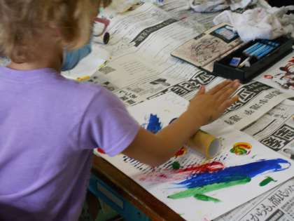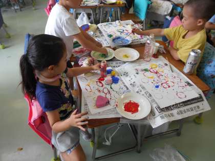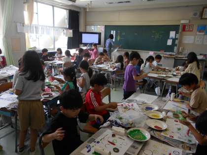 1年生の図工では「スタンプぺったん」の学習をしています。カップ、トイレットペーパーの芯などの身近な材料をスタンプにして、その形をいかしながら、さまざまな模様を描きました。色の重なりも工夫しながら、ぺったんぺったんとスタンプを楽しみました。完成した作品を「いろんな色を使ったよ!」「これは芸術的でしょ!」と嬉しそうに紹介してくれました。