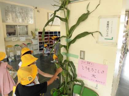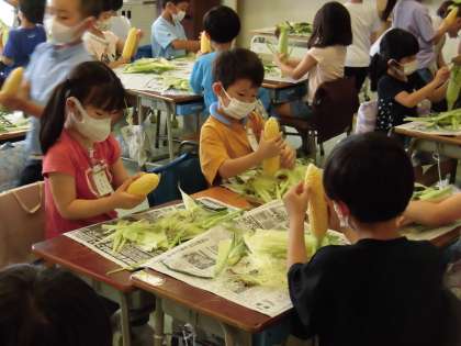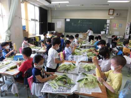 今日、1年生とひまわり学級で「とうもろこしの皮むき」を行いました。朝一番で、大きな立派なとうもろこしが配られて、ひとり1本、皮をむきました。きれいに皮がむけると、「わぁ、すごーい!」「おいしそう!」「早く食べたいなぁ」という声がたくさん聞こえてきました。明正小のみんなの今日の給食のゆでとうもろこしになるため、朝から一生懸命に行いました。廊下には、とうもろこしが実った、大きく育った苗が展示されています。どのようにとうもろこしが実るのかじっくり観察する姿がたくさん見られました。
