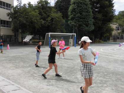学級会で話し合い、お楽しみ会などが企画されています。今日、校庭では「ウォーターフェスティバル」を開催している学級もありました。持ち寄った水鉄砲で水遊びを思う存分行い、笑顔あふれる学級会になりました。進行も協力してスムーズに進めることができ、水分補給も忘れすに、休憩しつつ、楽しむことができました。