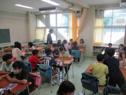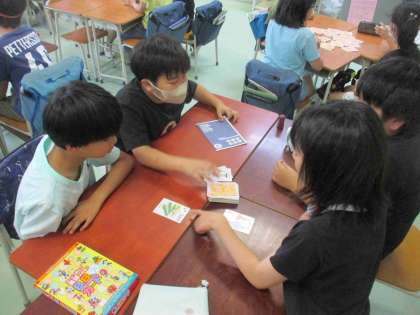 5年生が外国語で、代名詞を学習しています。She、He、Theyなど、カードをめくって、ゲームを通して発音していました。みんな楽しそうに取り組んでいます。
