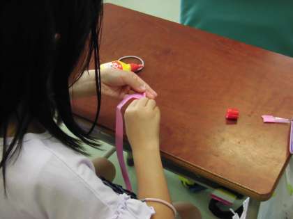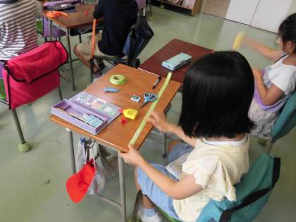 2年生の図工では、コマ作りを行いました。色とりどりの紙テープとつまようじを使ってコマを作りました。紙テープにボンドを塗り、つまようじにキュッキュッとしぼりながら巻いていきました。色を変えながらカラフルなコマを作っていました。つまようじに巻くのに悪戦苦闘している様子も見られましたが、とても楽しく取り組むことができました。