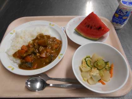 夏野菜のカレー こんにゃくサラダ すいか 牛乳