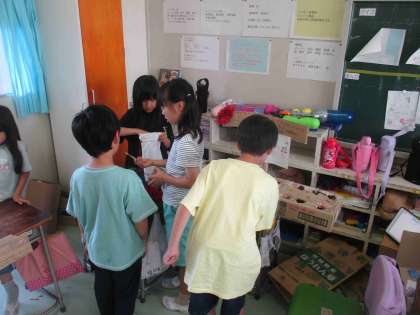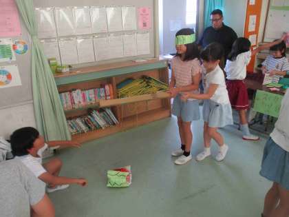 3年生の「夏祭り」は、いろいろなお店が作られていて驚きました。「スイカ割り」「射的」「ボール入れ」…工夫がたくさんされていて感心しました。いろいろな教職員も訪れて楽しませてもらいました。