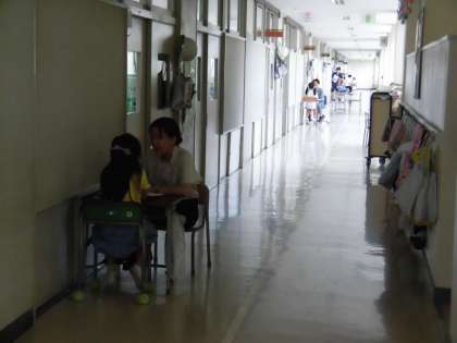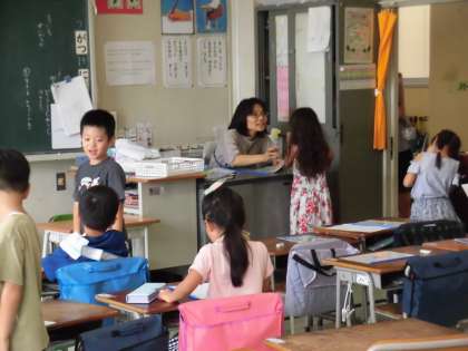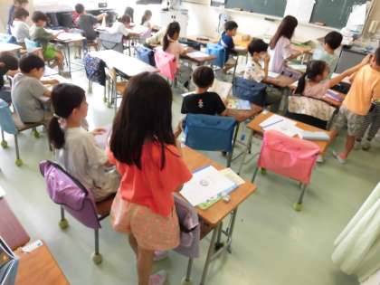 各クラスでは1人1人に通知表が手渡されました。担任からは頑張りをほめる言葉や、2学期に向けてのアドバイスがおくられました。初めて通知表を手にした1年生に感想を聞いてみました。「もらう前はどきどきした。」「作文がきれいに書けたねってほめられて、嬉しかった。」「お父さんお母さんに早く見せたい。」と笑顔を見せてくれました。中にはもらった後、スキップをしながら席に戻るかわいらしい姿も見られました。