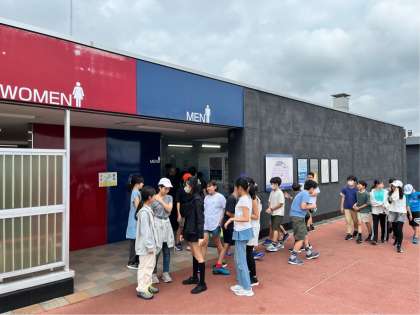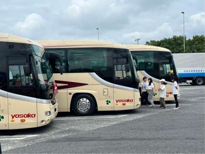 羽生パーキングエリアに到着しました。多くの学校が来ていて混んでいることが多いのですが、今日は空いています。バスの中は、バスレクで大盛り上がりです。