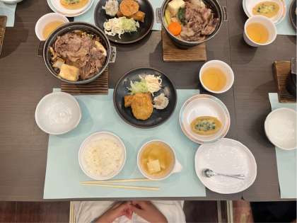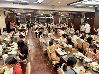 2日目の夕食です。ハイキングでたくさん歩いたので、お腹がペコペコだそうです。ご飯のおかわりに列ができています。