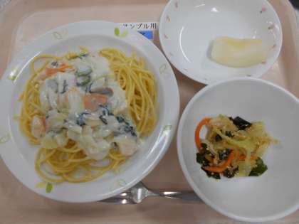 スパゲティえびクリームソース わかめサラダ 梨 牛乳