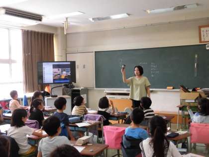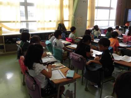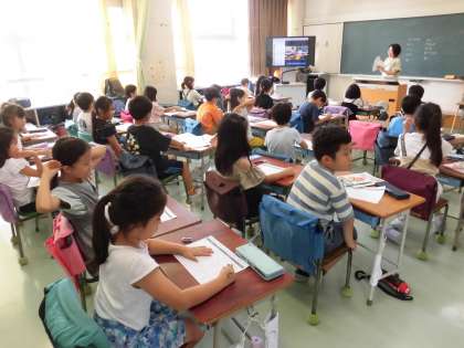 2年生の音楽では、学習発表会に向けて準備が始まりました。今日は、発表会で使う何種類もの楽器について、先生から教えてもらいました。「メタルカバサ」や「ウッドブロック」などの珍しい楽器の使い方を学び、どんな音がするのか聞き、自分たちでも実際に体験しました。「思ったより軽い!」「面白い音がでる!」と興味津々の様子が見られました。マラカスでもいろいろな形があることをも学ぶことができました。これから発表会でやってみたい楽器も選んでいきます。
