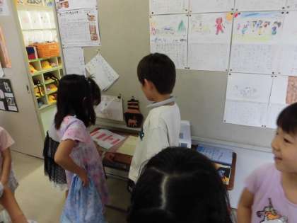夏休みに取り組んだ自由研究や自由工作が教室前の廊下にたくさん展示されています。休み時間になると、お友達の作品をじっくりみている姿が見られます。「すごいなぁ」「おもしろいなぁ」とお互いに取り組んだ成果を見て学び合っているようです。絵日記にもたくさんの楽しい思い出があり、その時の様子や気持ちが伝わってくるものばかりです。