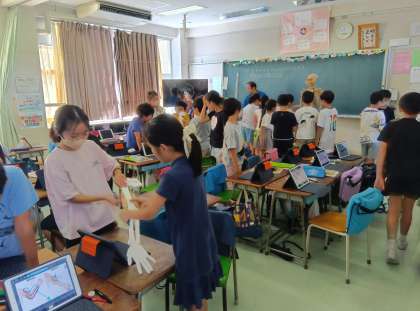前の時間に、手や腕には骨や関節があることを学びました。今日は、「腕はどのように動くのだろう」という問題を解決するために、本や腕の模型を使って友達と協力して調べました。
