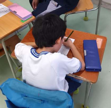 ひまわり学級、国語授業の様子です。授業のはじめにカタカナの学習をしました。カタカナの表記の言葉を見つける活動では、車の名前やポケモンの名前などたくさんの言葉が出てきました。プリントにも、集中して取り組み丁寧な字を書いていました。