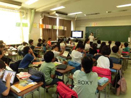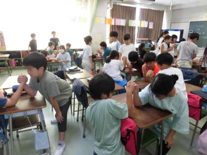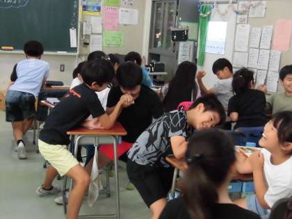 4年生の理科では体の働きについて学習しています。今日は「腕」はどのようになっているのか、どのような働きがあるのか考えました。腕の中には何があるのか予想をし、実際にどのようにしたら調べることができるのか話し合いました。そして、隣同士で「腕相撲」をし、その時の腕を触ってみて、どのような変化があるのか確認しました。グループで腕相撲をして気づいたことについて話し合いました。「なんで痛くなるんだろう?」「腕の中の何が痛くなっているの?」という声も聞こえてきました。