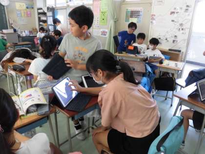 5年生の理科では「台風と防災」について学習しています。台風が近づくことによる天気の変化と関係について、台風でどのような被害がおこるのかについて理解を深めました。そして、台風が来る前に自分たちが取り組むことができる防災対策について、教科書やiPadを活用し、調べまとめました。台風が多い季節となり、学習したことが日ごろの生活にも活かすことができそうです。