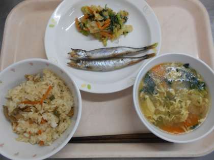 きのこごはん 焼きししゃも 野菜のごま和え 卵入り白玉汁 牛乳