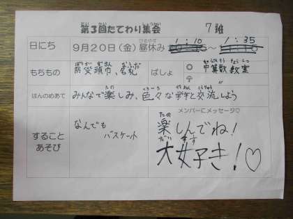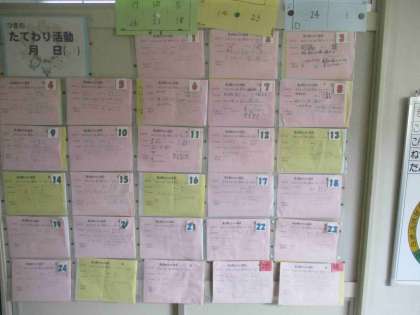 20日は、2学期最初の「縦割り班活動」を予定しています。各班の6年生が話し合って計画を立て、班担当の先生と内容を確認します。できあがった計画は、職員室前の廊下に掲示します。廊下を通る6年生以外の子たちも自分たちの班の計画を見て、内容や場所を確認します。「○○やるんだ!やった!」という声も聞こえてきました。たくさんの子たちが楽しみにしています。みんなが楽しめるように6年生たちが考えています。6年生、ありがとう。