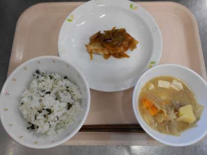 わかめごはん 鮭の野菜あんかけ 豚汁 牛乳