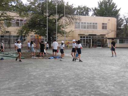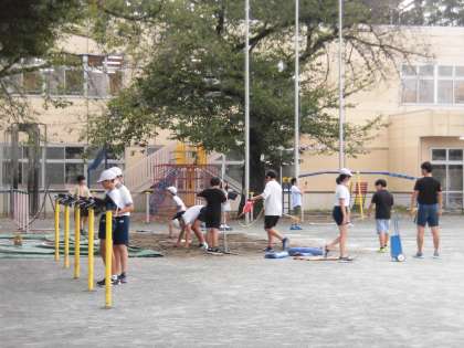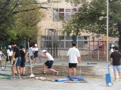 6年生の体育では走り幅跳びの学習をしています。どのような助走のリズムで跳ぶと、遠くに跳べるのかを考えながら、何度も挑戦しました。砂場をならしたり、距離をはかる作業も分担して行いました。また、iPadを活用し、動画を撮りあい、自分のフォームを確認することができました。さらに遠くに跳ぶための課題を見つけ、ふりかえりもしっかりと行いました。