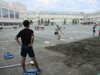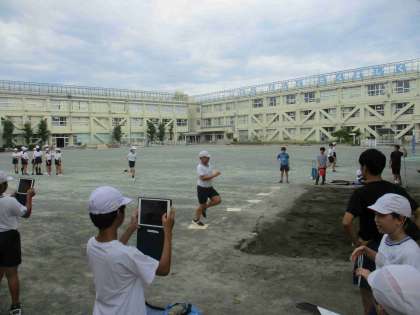 6年生は、体育で走り幅跳びに取り組んでいます。模範になる跳び方を動画で見たり、友達と協力して跳んでいるところを動画に撮って見合ったりして、活動しています。学習を通して自分の記録が伸びることを期待しています。
