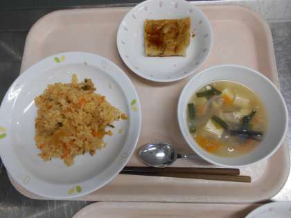 キムチチャーハン にらと豆腐のスープ じゃがいものチヂミ 牛乳