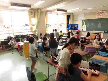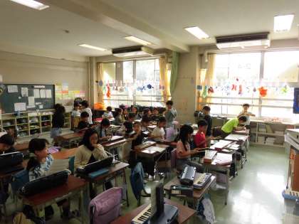2年生の音楽では、学習発表会の練習が進んでいます。それぞれ、担当の楽器の使い方を学び、練習が始まりました。鍵盤ハーモニカ、カスタネット、タンブリン、木琴、鉄琴、マラカスなどなど、様々な楽器を使って演奏します。初めて見るような珍しい楽器もあり、楽譜を見ながら一生懸命に練習を積み重ねていきます。