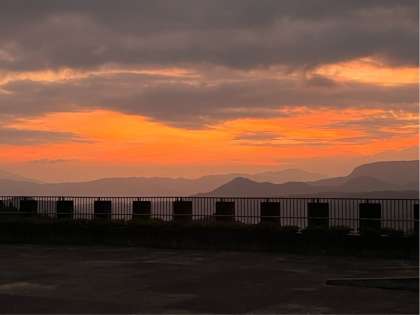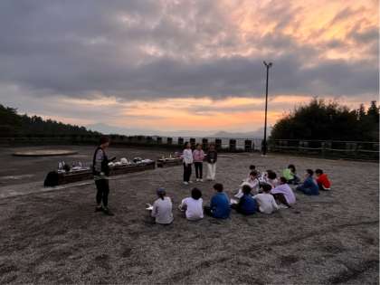いよいよキャンプファイヤーです。係の皆さんがしっかり準備してくれています。夕焼けがきれいです。