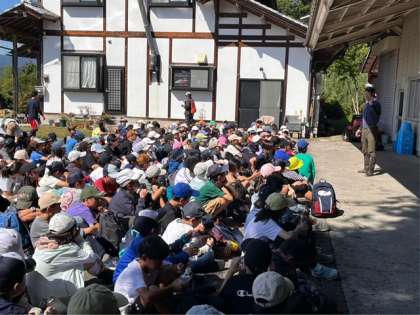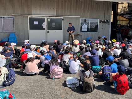 リンゴ園に到着しました。農家の方から米やリンゴ作りについてお話を聞いています。
