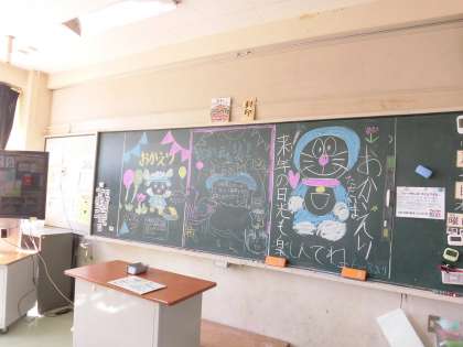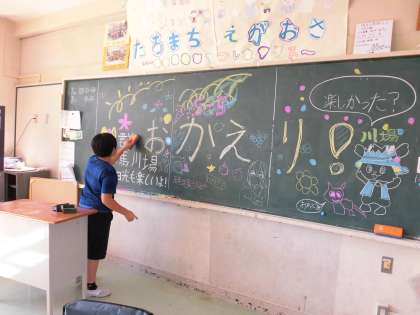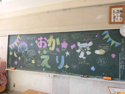 5年生が本日川場から帰校します。出発前に「宿泊のこころえ」というプレゼントしてくれた6年生が、おかえりなさいの気持ちを黒板アートに込めて描いてくれました。給食の準備中には、ひとりの児童が手直しをしてくれていました。今日は5年生が教室に入らず解散となりますが、明日登校した時の喜ぶ姿が目に浮かぶようです。