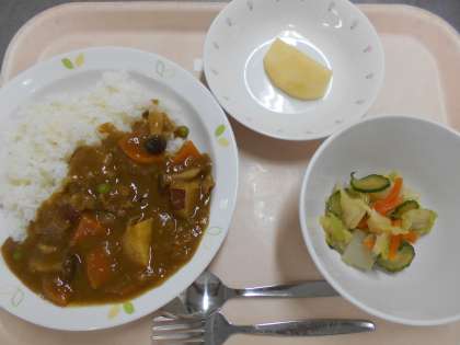 秋のカレーライス こんにゃくサラダ りんご 牛乳