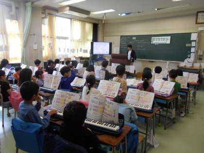 1年生の音楽「どれみとなかよくなろう」では、鍵盤ハーモニカを使って、様々な曲に挑戦しています。今日は「なかよし」の曲を鍵盤ハーモニカで演奏しました。鍵盤ハーモニカと歌の担当にわかれて、鍵盤ハーモニカの音に合わせて大きな声で歌いました。2学期から鍵盤ハーモニカの学習が始まりましたが、準備の仕方、音の出し方も慣れてきて、とても楽しく学習し、教室にはきれいな音色が響いています。