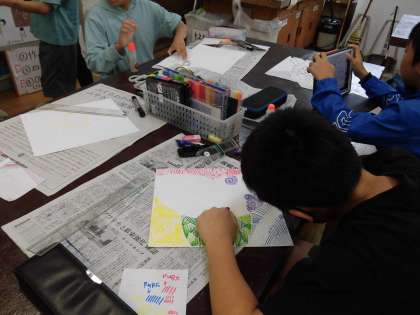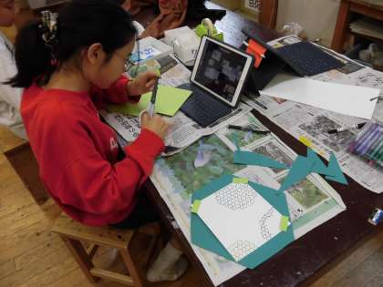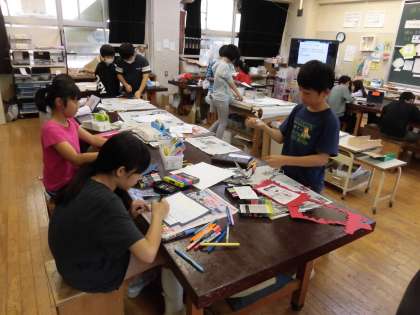 5年生の図工では「線から生まれた私の世界」の学習をしています。サインペンやボールペンや鉛筆など様々な道具を使って、線のかき方、線の太さや長さ、組み合わせを工夫して自分のイメージする世界を描いていきました。画用紙の形や向き、台紙の形にも工夫を凝らしていました。次々と完成した作品はどれも素敵な「線」の世界がひろがっています。