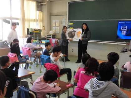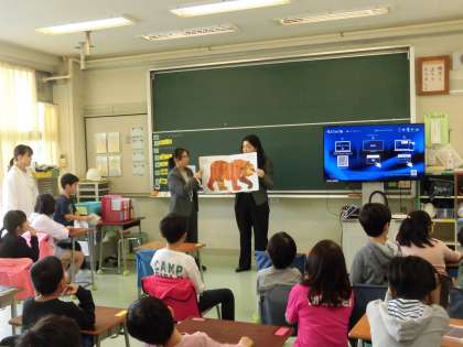 ALTのアイリーン先生と一緒に過ごしたイングリッシュウィークも今日が最終日となりました。外国語の授業だけではなく、朝の時間や給食の時間にも子どもたちと交流し、英語によるコミュニケーションを増やすことができました。ひまわり学級の英語の本の読み聞かせでは、「Brown Bear, Brown Bear, What Do You See?」の絵本を読んでいただきました。アイリーン先生の読み聞かせに、目を輝かせている様子がみられました